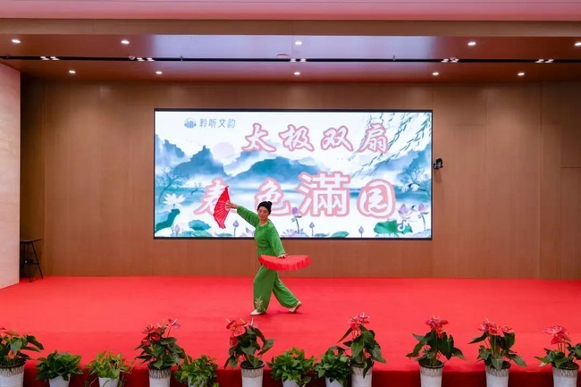 任玲玲阿姨身着太极服登场,带来武术表演《太极双扇》。她手持双扇,起势缓慢沉稳,扇影流转间尽显太极韵味,动作刚柔并济,每一个转身都透着从容。