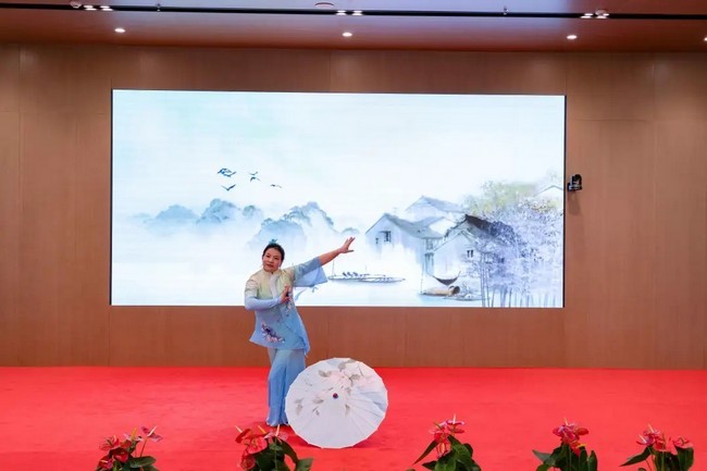 康缘酒店市场部邰慧敏身着蓝白古典舞服装,带来独舞《梦里水乡》。她舞步轻柔舒缓,手臂舒展如流水,旋转时裙摆如波浪起伏,将江南水乡的柔情与诗意展现得淋漓尽致,台下观众静静欣赏,仿佛置身于烟雨朦胧的水乡之中。