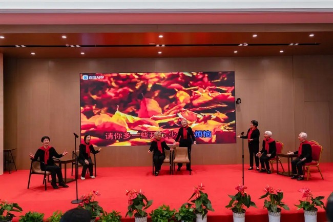 重阳庆典以康缘合唱团的《最美不过夕阳红》拉开帷幕。18位长者身着演出服,歌声温柔醇厚,“最美不过夕阳红,温馨又从容”的旋律响起时,台下长者纷纷跟着轻唱,熟悉的歌词里满是对晚年生活的珍视,瞬间让现场漫溢着温暖的氛围。