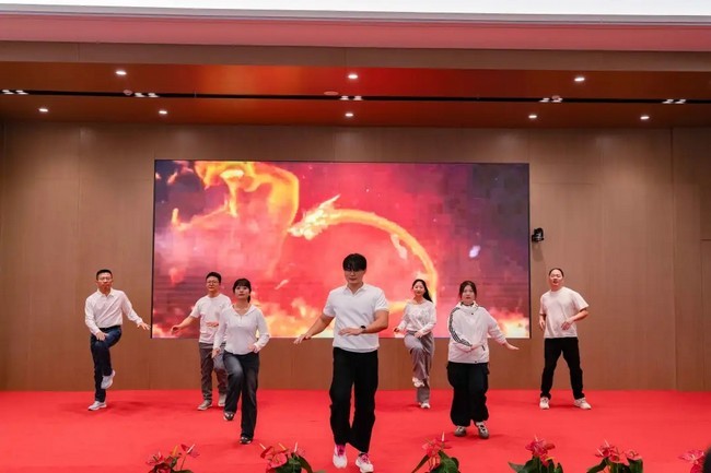 康缘市场部员工身着红色活力短袖,带来热力四射的舞蹈《潇洒走一回》。他们踩着经典旋律,动作洒脱有力,抬手摆臂间满是活力,既还原了歌曲的豪迈气质,又展现了市场部员工的朝气。